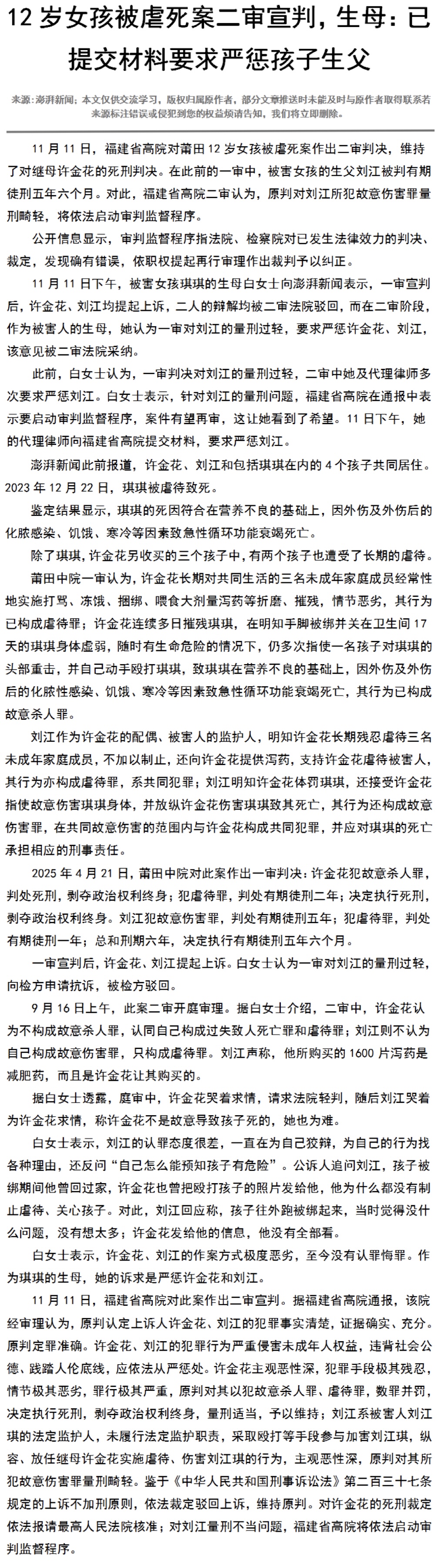 12岁女孩被虐死案二审宣判,生母:已提交材料要求严惩孩子生父