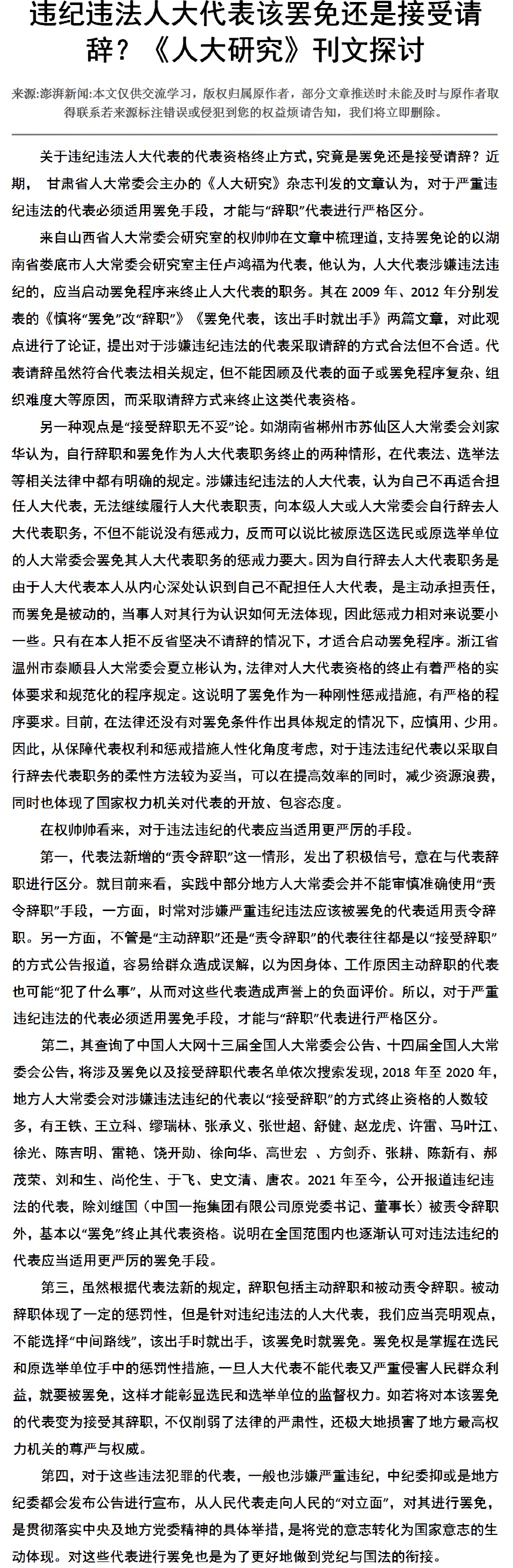 违纪违法人大代表该罢免还是接受请辞?《人大研究》刊文探讨