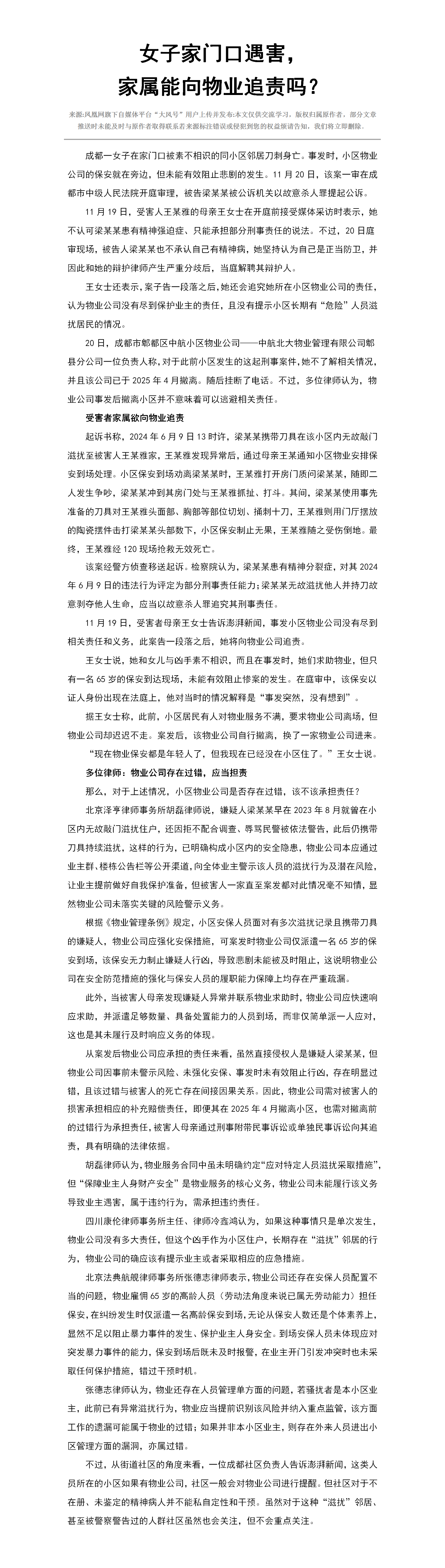 女子家门口遇害, 家属能向物业追责吗?