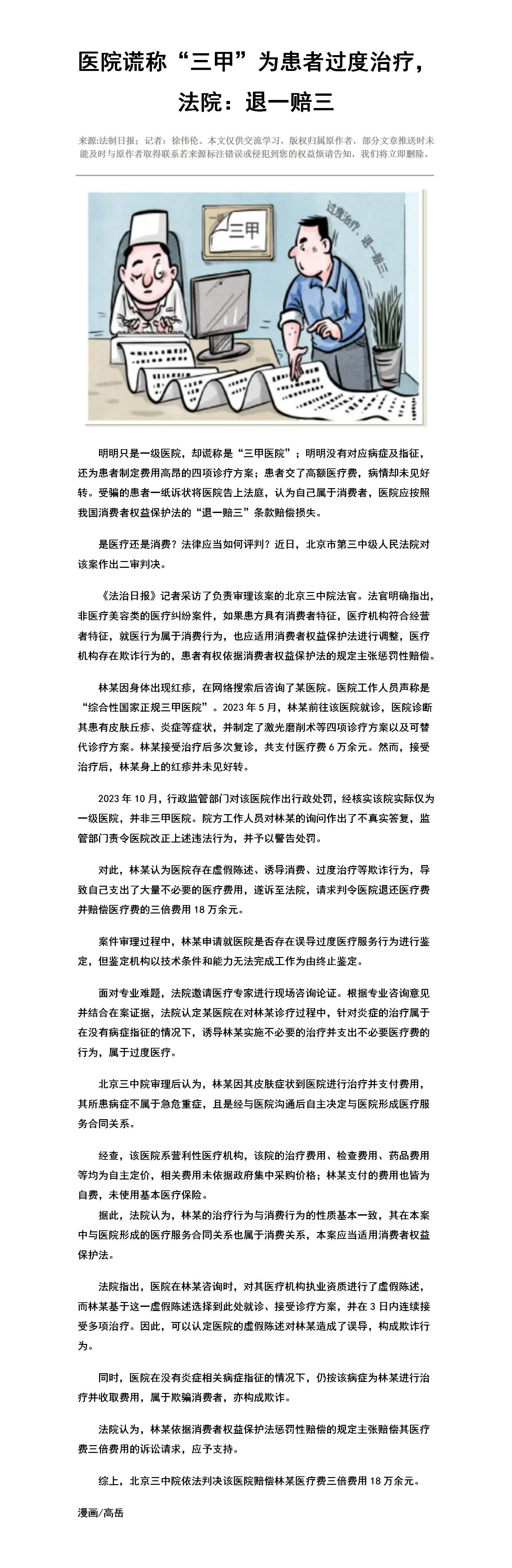 医院谎称“三甲”为患者过度治疗,法院:退一赔三