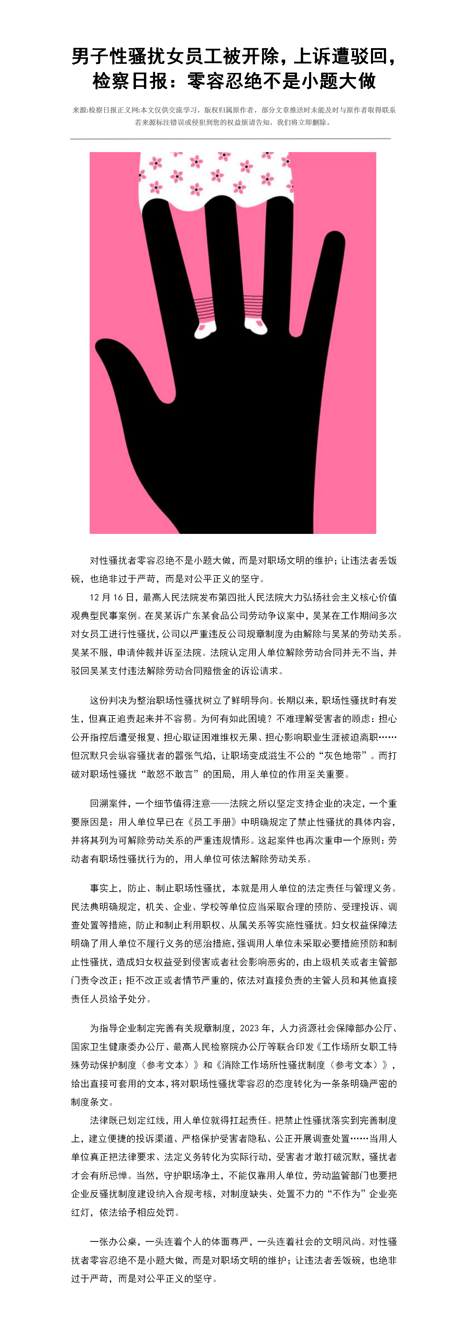 男子性骚扰女员工被开除,上诉遭驳回,检察日报:零容忍绝不是小题大做