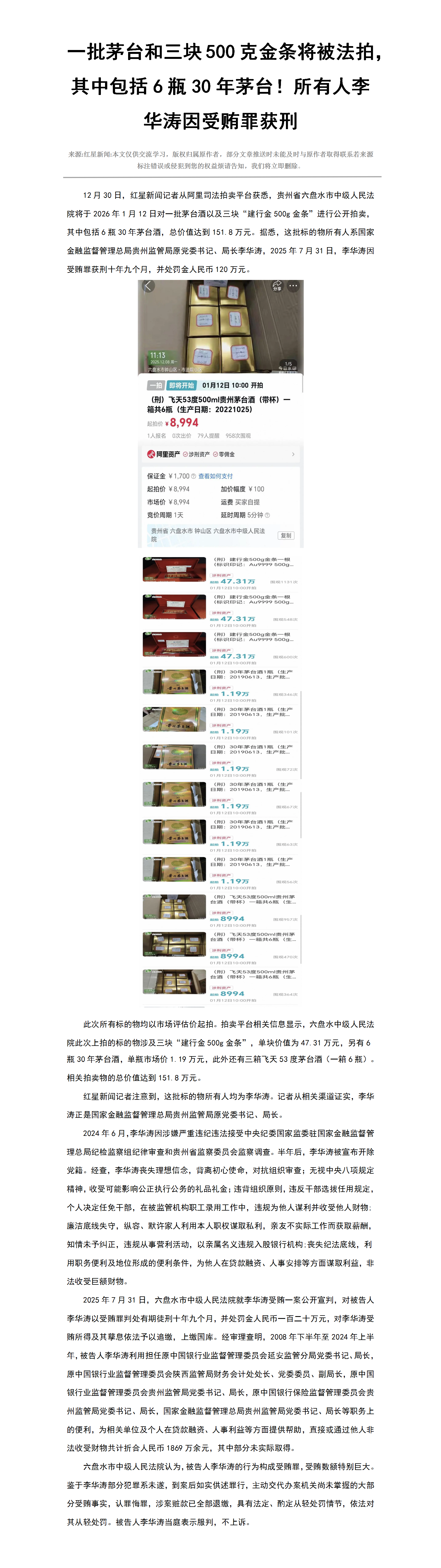 一批茅台和三块500克金条将被法拍,其中包括6瓶30年茅台!所有人李华涛因受贿罪获刑
