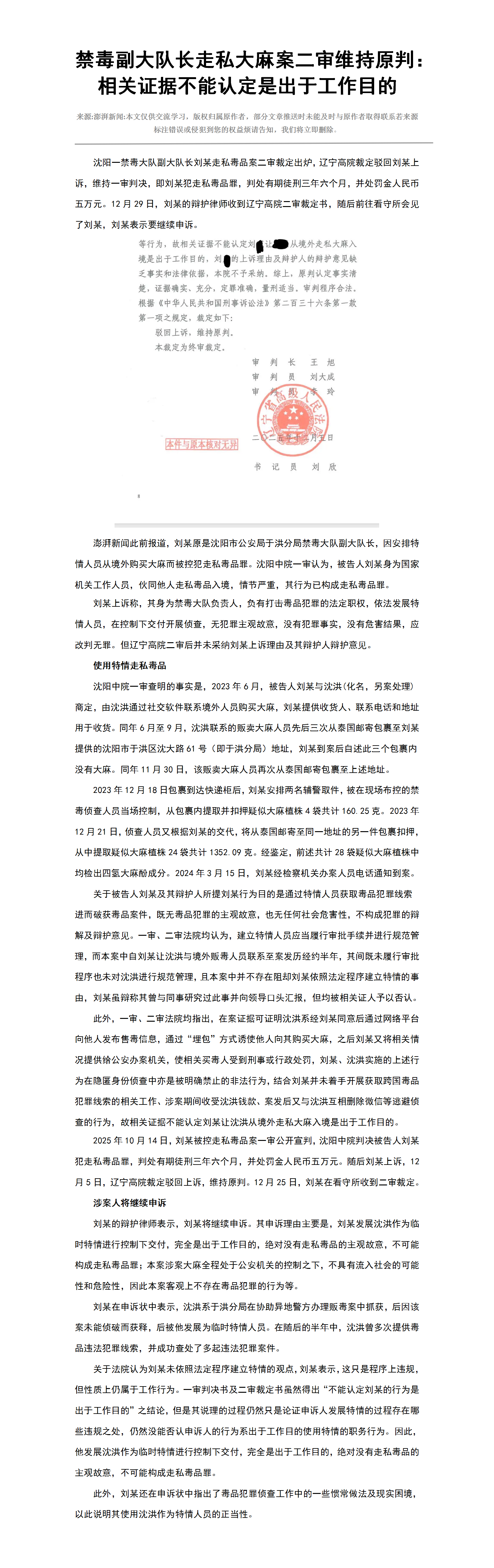 禁毒副大队长走私大麻案二审维持原判:相关证据不能认定是出于工作目的
