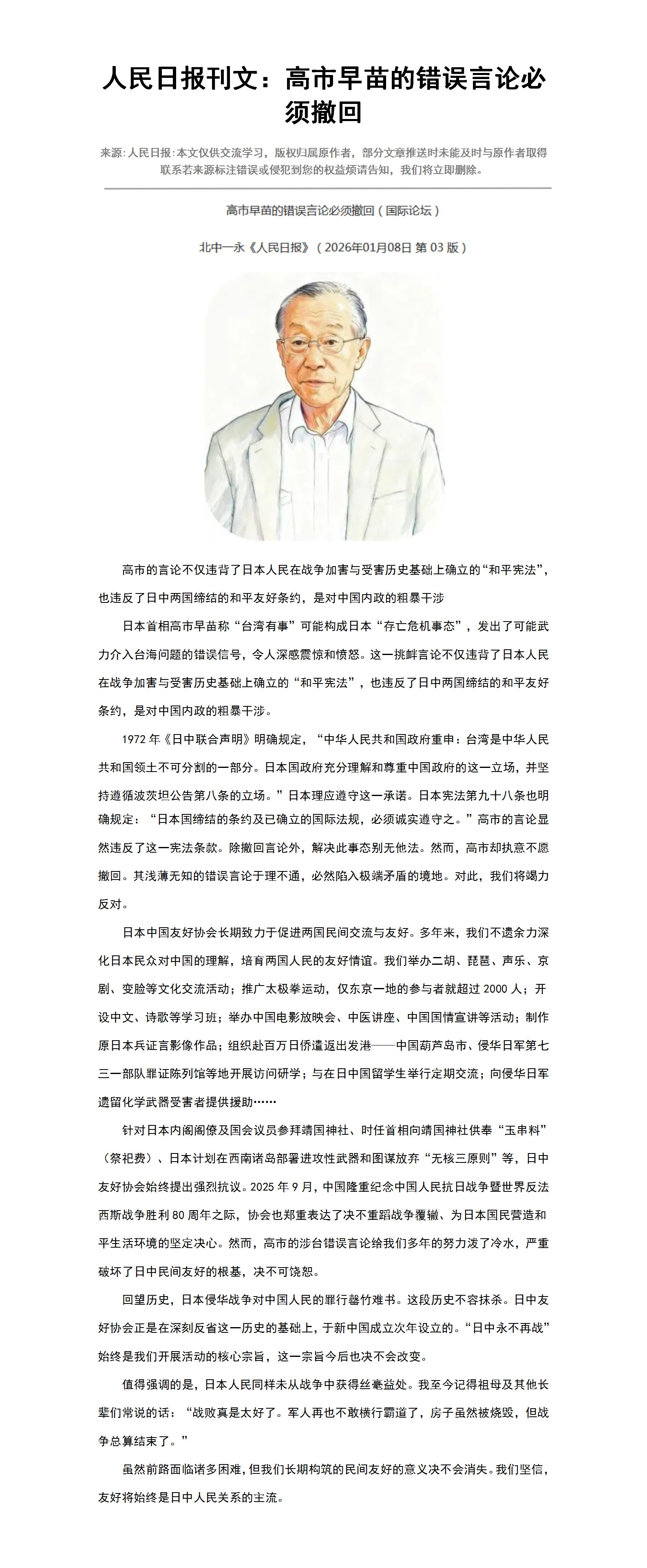 人民日报刊文:高市早苗的错误言论必须撤回