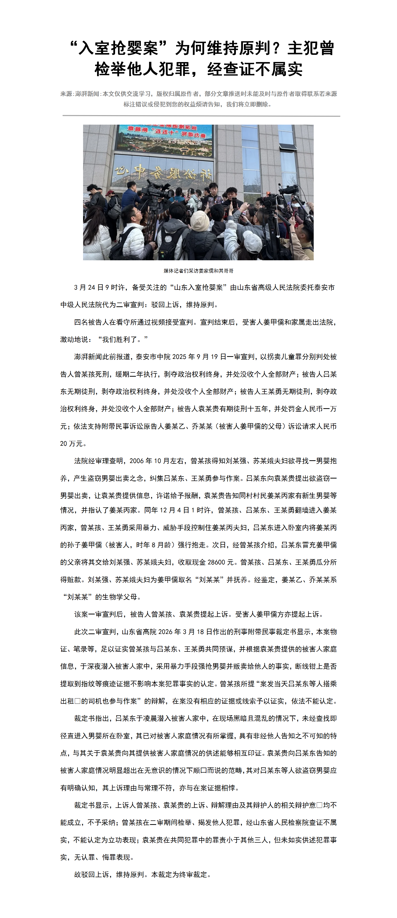 “入室抢婴案”为何维持原判?主犯曾检举他⼈犯罪,经查证不属实